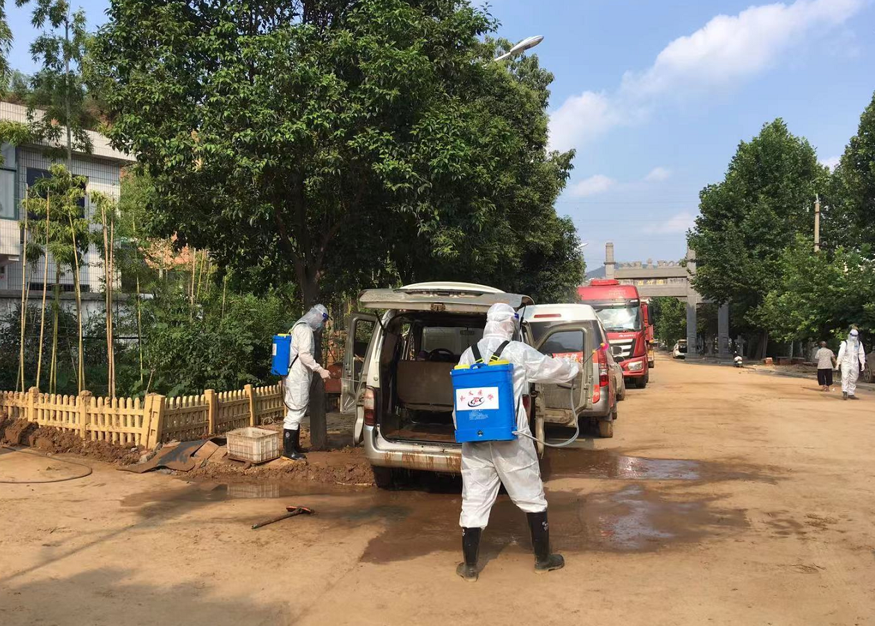 消杀工作采用一级防护,选择一次性外科口罩、连体医用防护服、一次性橡胶手套、靴子,大家对洪水过后污水蔓延地面、楼房建筑、进水区域进行防疫消毒,并对垃圾桶、淤泥堆积地带进行重点消杀。