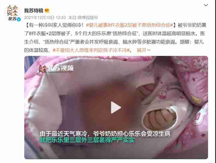 气温骤降,家长恨不得给孩子裹成“小粽子”。但这种保暖方式,很可能给孩子捂出病来! 江苏一家爷爷奶奶,因为担心5个月的小婴儿受凉,里里外外裹了“8件衣服+2层厚被”,结果导致宝宝患上“捂热综合征”。送到医院的时候,婴儿呼吸急促,有明显脱水症状,体温出现超高温。 湖南长沙,一个49天大的小婴儿,父母因为担心孩子晚上睡觉着凉,给穿了两层衣服,身上还裹着戴帽子的包被,外面又加盖了一层被子。第二天发现大汗淋漓、口吐白沫,突发“捂热综合征”住进ICU。 每年冬天,患上"捂热综合征"的儿童不在少数,中招的多是3岁以下的孩子。明明是怕孩子感冒,怎么就"捂"出病来了呢? “捂热综合征”可比感冒严重多了 婴幼儿比成人的新陈代谢要活跃,机体产生的热量也比成人多,但体温调节中枢还未发育健全,出汗散热较为缓慢。本来孩子就挺热的,家长还怕不够热,使劲往身上套,严重影响了婴儿的散热,就会引发“捂热综合征”。热量散不出去,体温急剧上升,婴儿就会处于高热状态,大量出汗,耗氧量明显增加。 小婴儿无力挣脱“捂热”环境,持续下去即可引起呼吸衰竭、脑水肿等多脏器功能衰竭,造成永久损伤。处理不及时,甚至可导致婴儿在短时间内突然死亡,病死率高达18.33%。这才是真的,宝宝身上热,宝宝说不出。当发生“捂热综合征”的时候,孩子会出现高热或超高热,全身大汗淋漓,衣被湿透,脱水,面色苍白,哭声低弱,拒绝吃奶。 这与发烧的症状很像,好多家长会误以为孩子是发烧了,不仅不给孩子散热,还越穿越多,被子越盖越厚,很容易出汗过多加重脱水症状,导致宝宝休克。所以,当孩子出现以上症状时,家长就要警惕了,应立即给孩子松解衣扣、擦干汗水、减少包裹衣物,用温水洗澡降温,及时就医。婴幼儿自身的体温就很高,不要用大人的思维来判断孩子冷不冷! 睡觉不要盖厚被 使孩子患上“捂热综合征”的罪魁祸首之一,就是厚被。盖厚被,一个是会导致儿童被捂的太热,另一个是有遮盖住口鼻、导致窒息的风险。小婴儿面对厚被,完全没有“还手之力”。 如果盖薄一点的被子,盖到胸就可以了。并且要把宝宝的手放在外面,防止手一扑腾,把被子掀到脸上,导致缺氧、窒息。当然,婴儿睡觉最好是穿睡袋,比盖被子安全多了,即宽松又不用担心孩子扑腾。除了不能盖厚被,睡觉尽量不给宝宝戴帽子,婴儿体温高,捂出汗不仅不能保温,还更容易感冒、生湿疹。 孩子是冷是热如何判断? “捂热综合征”除了盖的厚,再就是穿的多。穿少了怕冻着,穿多了怕捂热,该怎么判断孩子是冷是热呢?方法很简单,一个字“摸”。 摸摸孩子的后背或者小肚子,如果温温的,没有汗,就是正合适。这个时候孩子的手脚是偏凉的,因为婴幼儿循环功能差,手脚的温度是会比肚子、颈背这些区域的温度更低。 如果摸后背发现出汗了,手脚温热,就说明穿多了。如果后背凉凉的,才说明冷了,该加衣服了。 洋葱穿衣法孩子好动,本来穿的厚度正合适,下一秒就蹦跶出汗。怎么穿衣服,才能应付孩子的体温波动和环境变化呢? 《美国儿科学会实用育儿百科》推荐宝宝用洋葱穿衣法。 洋葱穿衣法,顾名思义,就是像洋葱一层一层穿搭,能根据孩子的体温和环境自由穿脱。 1、内层是恒温排汗层 最里面这层衣服除了要贴身、柔软、舒适外,更重要是排汗效果要好。当孩子出汗,内层衣服如果不能吸汗速干,潮乎乎的,身体很快就会变凉。所以最里层一定要选排汗性好的贴身衣物,用来保持身体干爽,维持稳定的温度。 2、中层是保温层 这层衣服主要是给身体制造一个蓬松的空气隔热层,阻止热量的流失。羊绒、羊毛、抓绒等质地的衣裤都可以起到良好的保温效果,减少因寒冷导致的体温流失。 3、外层是防风防雨层 这层衣服要着重防风防水效果,给孩子与外界环境制造一层屏障,减少体表与冷空气的接触。 当刮风的时候,风不会穿透衣服,让身体立刻变凉。当雨雪突如其来,不会被立即打湿,维持身体的干爽。可选择有一定防风、防水、透气面料的羽绒服、棉衣、风衣等,抵御天气变化。 如果天气太冷,可以中间加个方便穿脱的羽绒马甲、毛背心。按照"洋葱穿衣法"穿,方便衣物的增减,还不会让宝宝体温骤降,做到室外、室内自由切换。 宝宝不被裹成粽子了,就可以自由尝试翻身、独坐、爬行、走路等动作,开启独立探索世界的第一步。 本文来源微信公众号:Neimbaum
