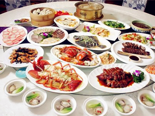 皇城红袍添喜庆——乳猪大拼盘、鸳鸯翡翠金腰带——蒜蓉蒸龙虾、锦绣百花如意球——杏鲍菰带贝、龙凤振翅冲天飞——原盅鸡炖翅、瑶池玉女网上鲍——珊瑚百花鲍、碧波游龙情意长——古法蒸石斑、星光金砂满华堂——蘑菰嫩羊排、十全美德如意盅——花胶炖北菰、喜获天赐玉麒麟——鲜百合芦笋、百年美眷庆好合——干贝芋头糕、佳偶永结齐同心——咖哩豆沙酥、瑞果呈祥合家欢——季节鲜水果。