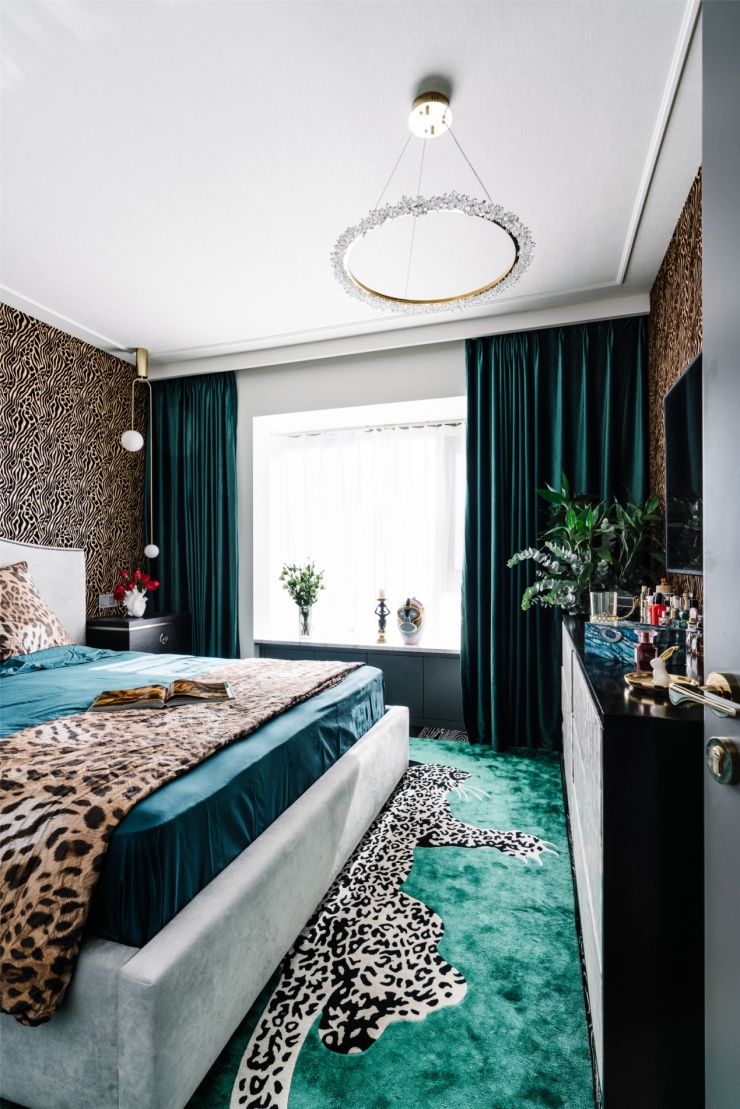 在这间现代化的卧室里,设计师大量使用的豹纹图案来迎合阿尔卑斯的秋天,起到了起承转合的作用。点缀其中的绿色成为整个房间的视觉焦点,与现代墙壁艺术相得益彰。圆形的水晶吊灯在一众暗色中脱颖而出,抵消掉豹纹的野性,辅以绿色的床品、窗帘,达到视觉的平衡,增强空间时尚感。