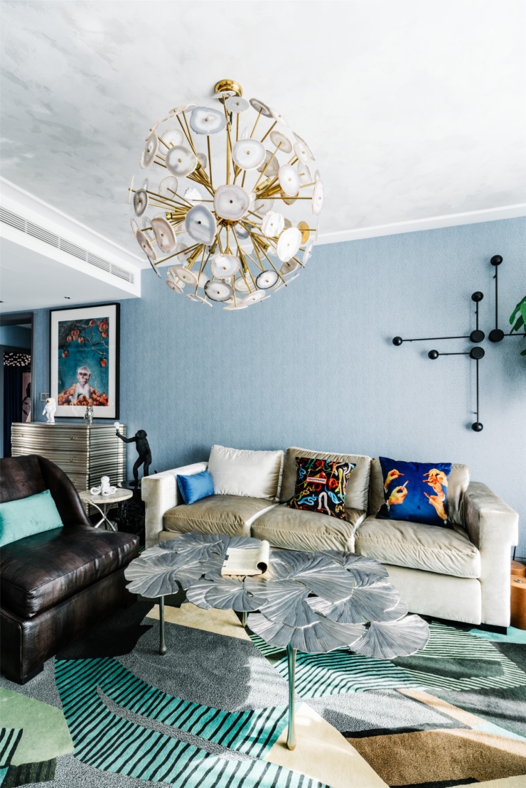 墙上的浮世绘是业主在日本旅行时带回,置于此处,给空间增添了一抹别样的异国风情。摩登抽象艺术家“猩猩家族”的雕塑花瓶更是点亮了整个空间,于细节处表现出业主对于生活的热爱,对生活品质的追求。