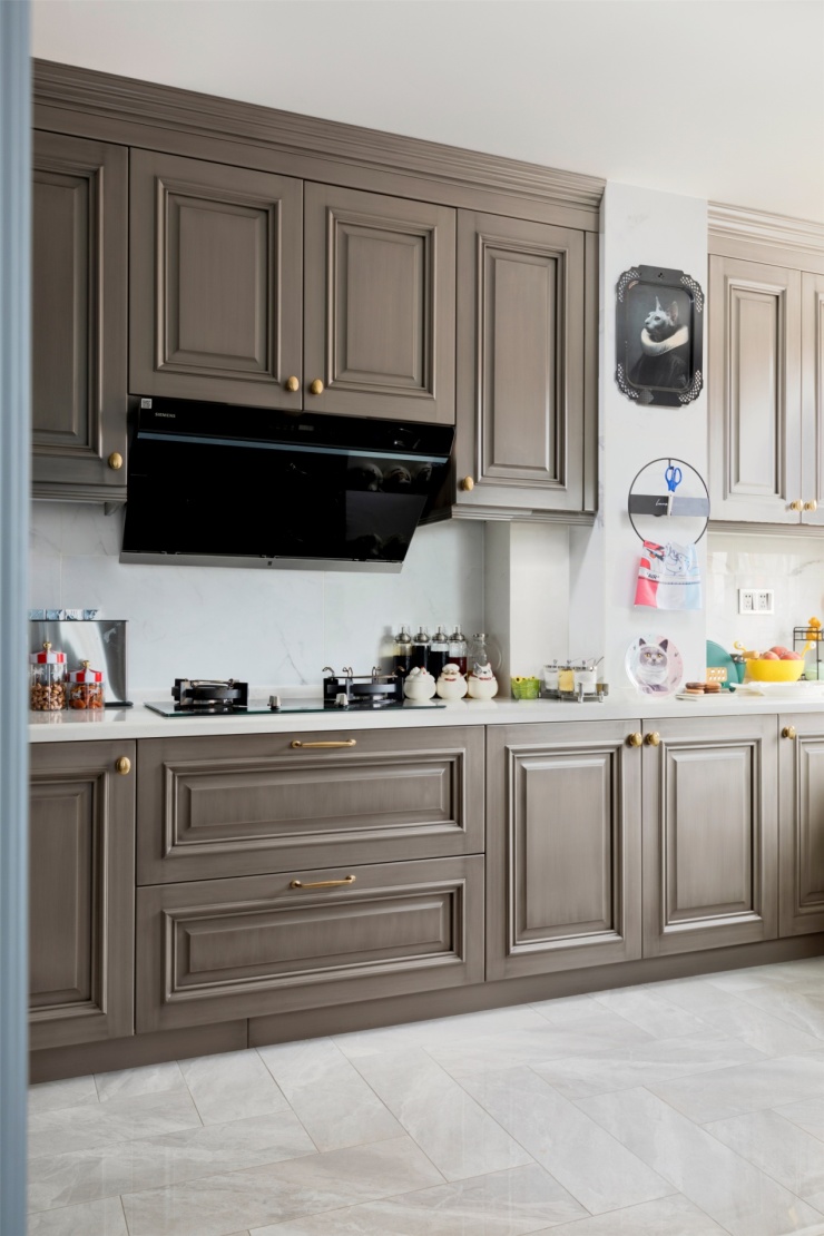 厨房设置在餐厅旁,动线合理,大理石料理台配合铜色橱柜极具现代感,线条干脆利落,良好的采光也保证了烹饪时的好心情。