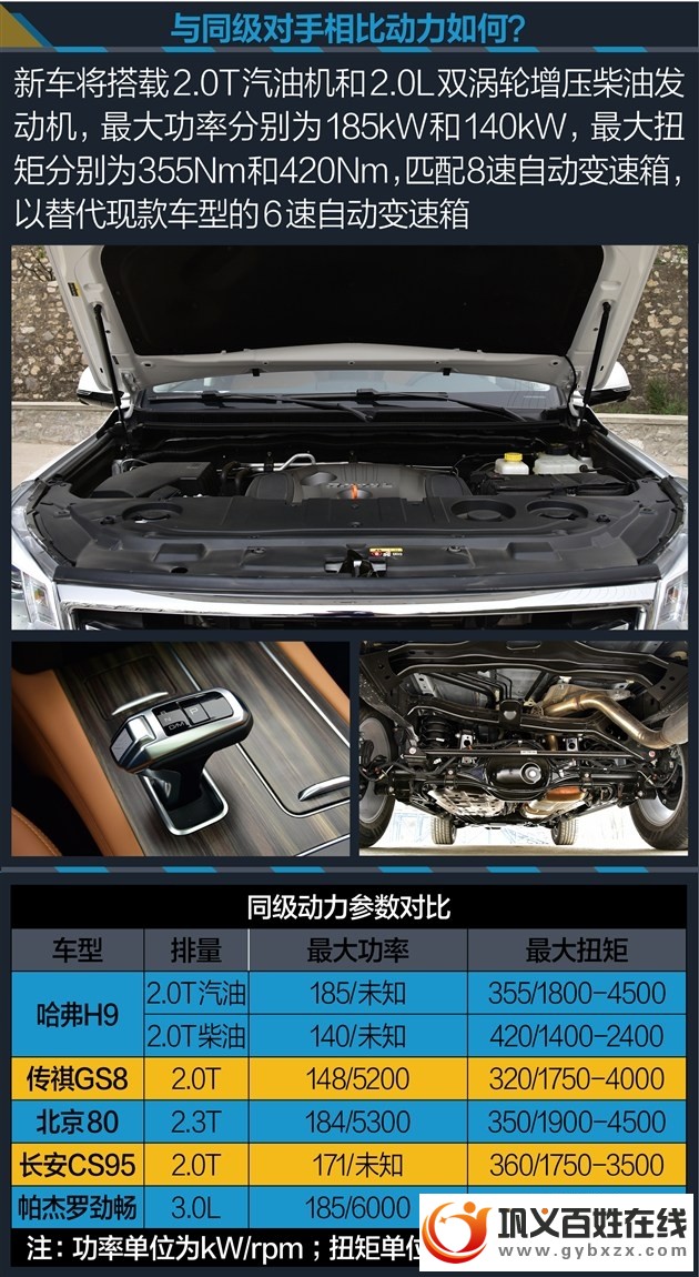 哈弗H9可以算是自主品牌车型,在中大型硬派越野SUV里的开山之作。从价格上看,传祺GS8、长安CS95和北京80是它最直接的竞争对手。与传祺GS8和长安CS95偏向城市定位不同,H9采用非承载式车身结构,还具备同级少见的全地形反馈系统,越野能力更强。