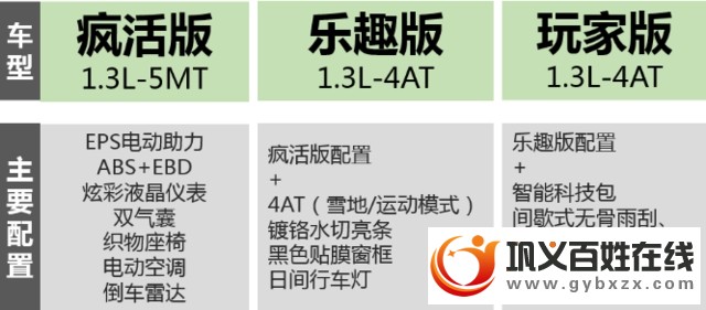 1.3L-4AT乐趣版车型在手动挡车型的基础上,增加更美观的镀铬亮条和LED日行灯,其匹配的智能手自一体变速器也将使驾驶更轻松。顶配1.3L-4AT玩家版则额外拥有无骨雨刷、全景天幕、D形多功能方向盘、双色皮质座椅、双色车身、定速巡航功能和X-Fun智能交互娱乐系统。尺寸达11.6英寸的高清触控彩屏内置了X-Fun智能交互娱乐系统,集成了语音交互、集成触控、高德导航、手机映射、WIFI互联、影音娱乐等诸多功能,可轻松连接安卓或苹果手机。 |